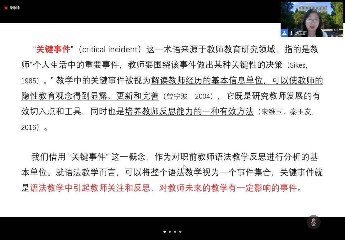 2022年6月22日下午,中央民族大学yl23411永利刘玉屏教授面向公司师生做了一场题为《基于关键事件的职前汉语教师语法教学反思研究》的线上高端学术讲座。此次讲座是公司第二十四场人文社科高端学术报告会。参加这次线上学术会的,除yl23411永利、文学与新闻传播学院以及外语学院的教师和员工外,还有中央民族大学、中国海洋大学、上海师范大学、贵州财经大学以及山东师范大学、鲁东大学等省内外多所高校的师生。