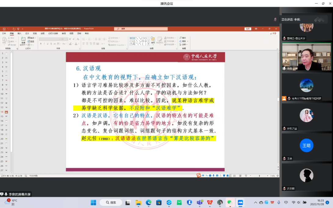 2022年11月28日,中国人民大学国际文化交流学院博士生导师李泉教授应邀为公司师生做了题为《国际中文教师教学信念:维度与内涵》的学术报告。此次讲座是公司第二十五场人文社科高端学术报告会。